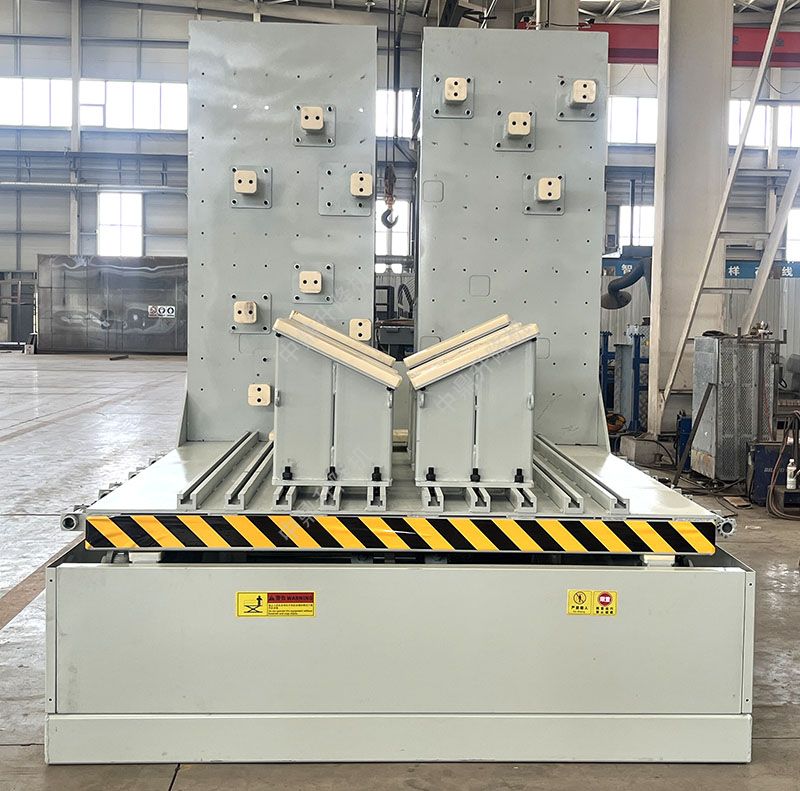 3. 翻转机结构分为90°两个台面,一个台面开U形通孔,另一个台面为平面,并安装一套可拆卸V形块,V形块尺寸根据产品规格定制;