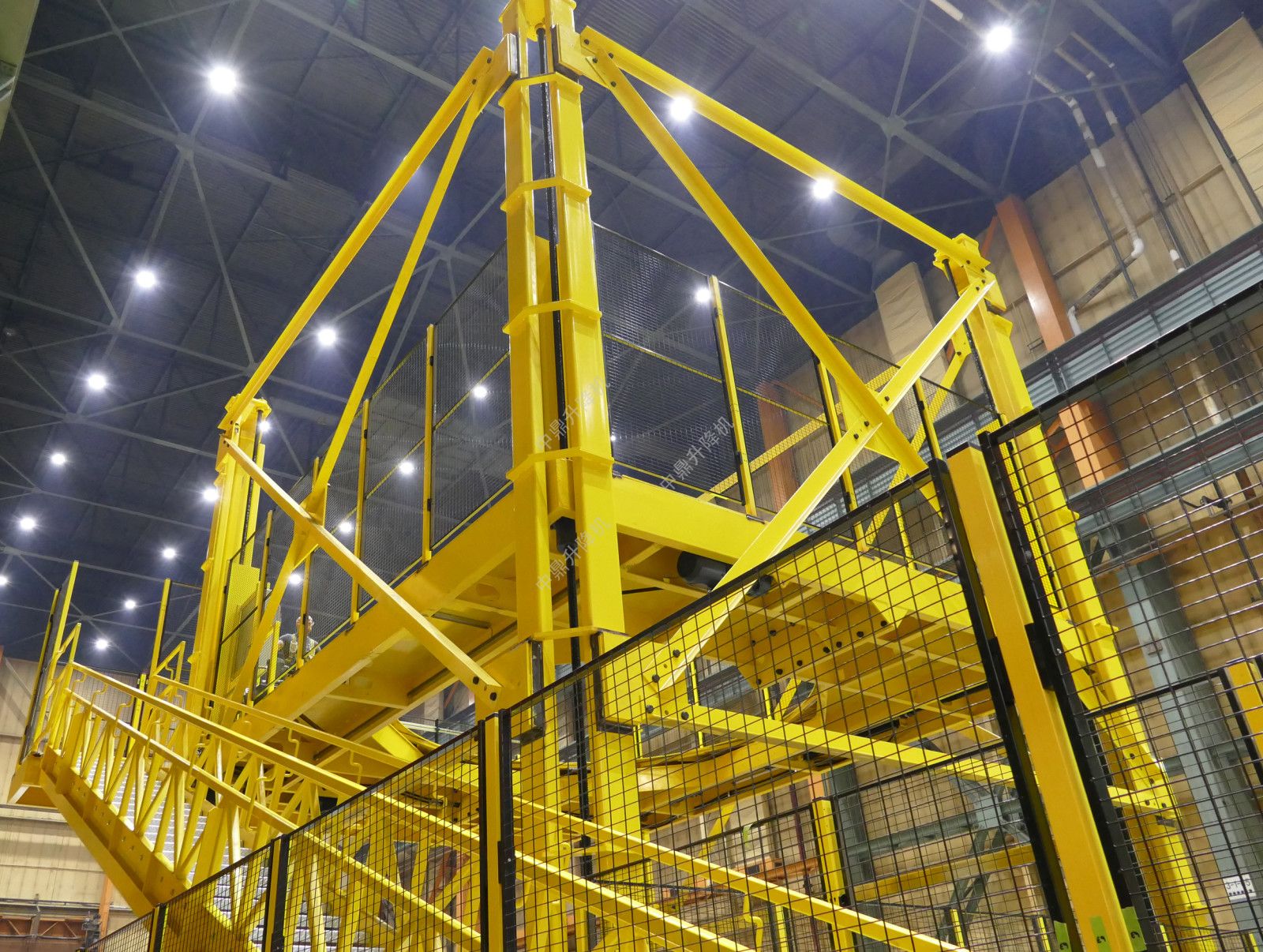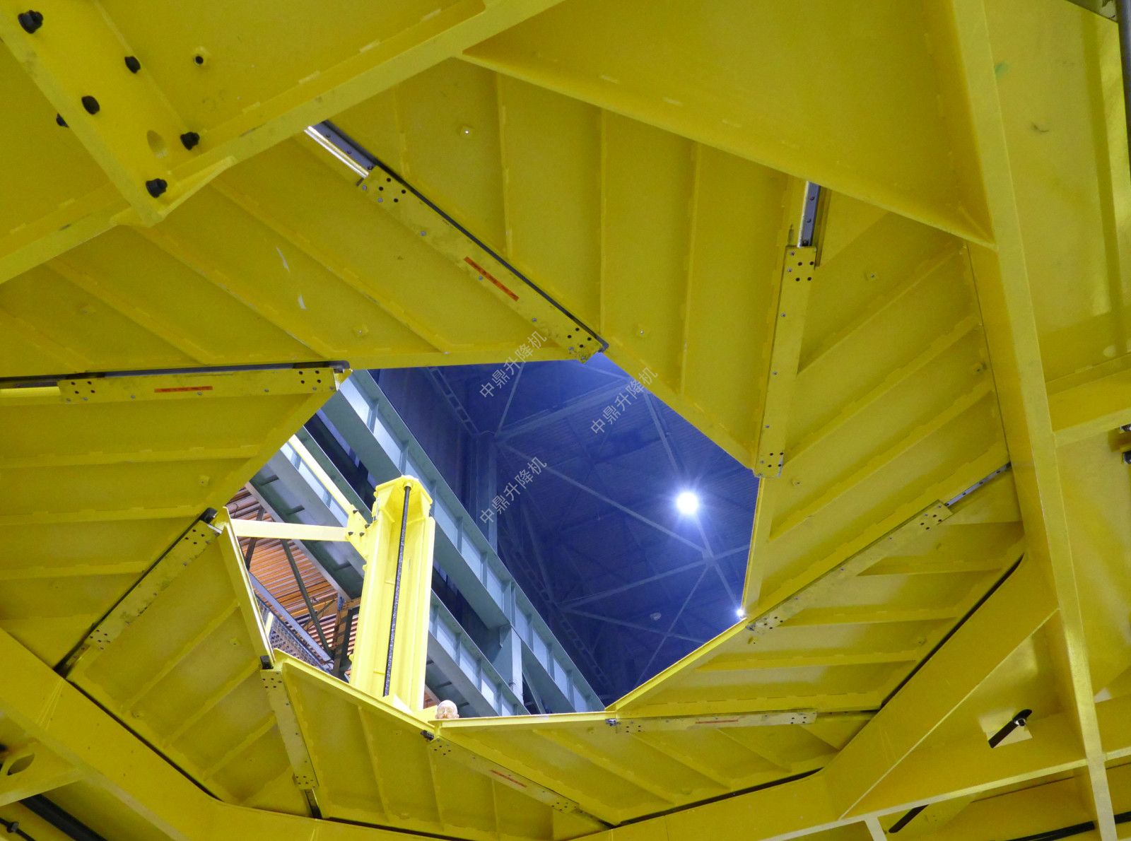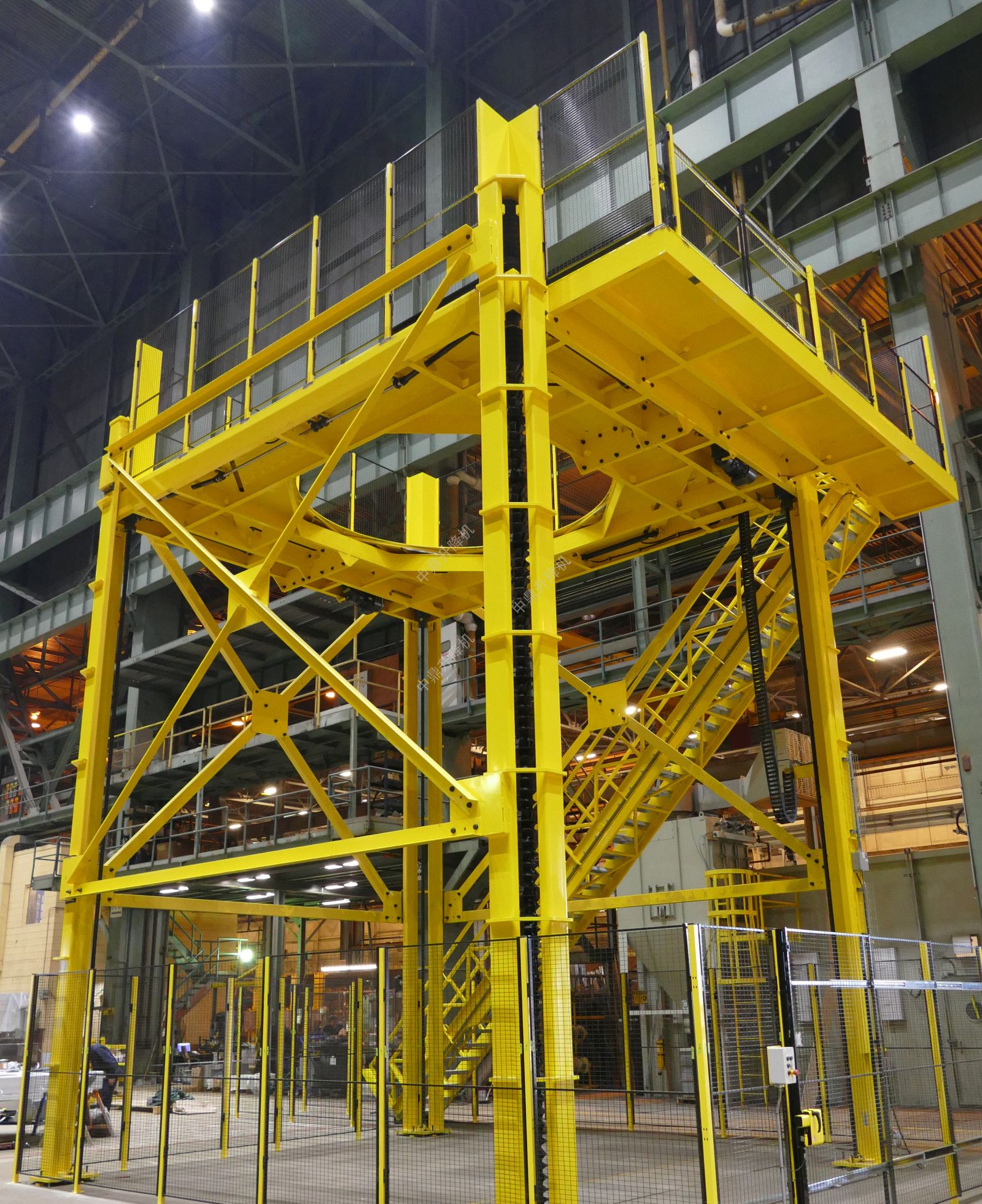 平台和楼梯组件的升降是通过放置在每个角柱上的四个滚珠丝杠驱动的,每个滚珠丝杠由强大的电机驱动,每个滚珠丝螺钉彼此机械同步。中央光圈开启驱动是液压的。
