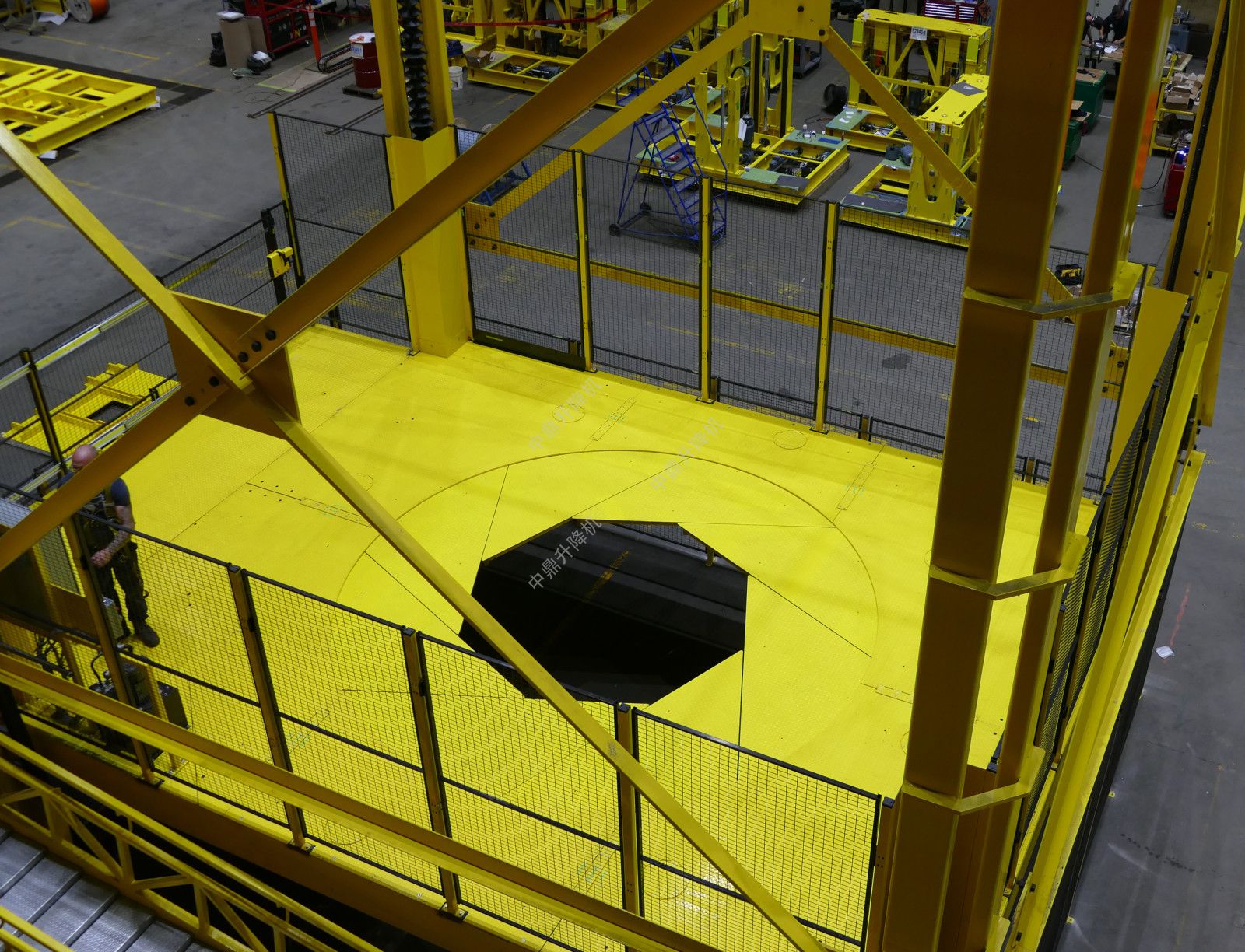 这种定制设计的垂直装配平台将用于在大型涡轮机建造过程中将技术人员定位在正确的高度和位置。该组件独特的虹膜开口允许在产品直径周围进行特殊放置,以便将涡轮机构建出来。